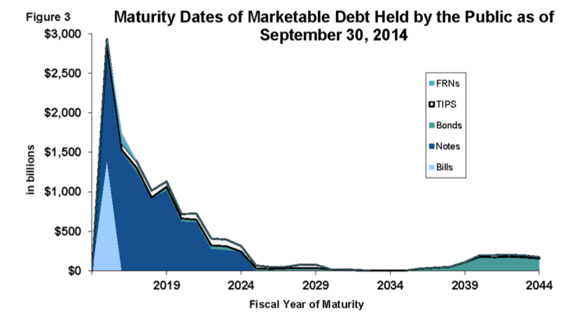 Chart is from Treasury Direct, GAO-15-157 Schedules of Federal Debt, Page 19. Note also that this is only the marketable debt–it excludes the $5 trillion+ (as of 9-30-14) of Intergovernmental Debt Holdings.